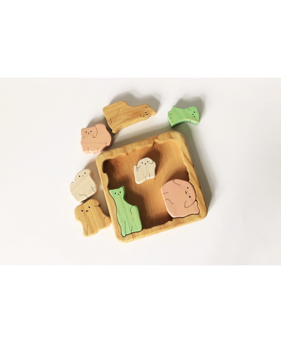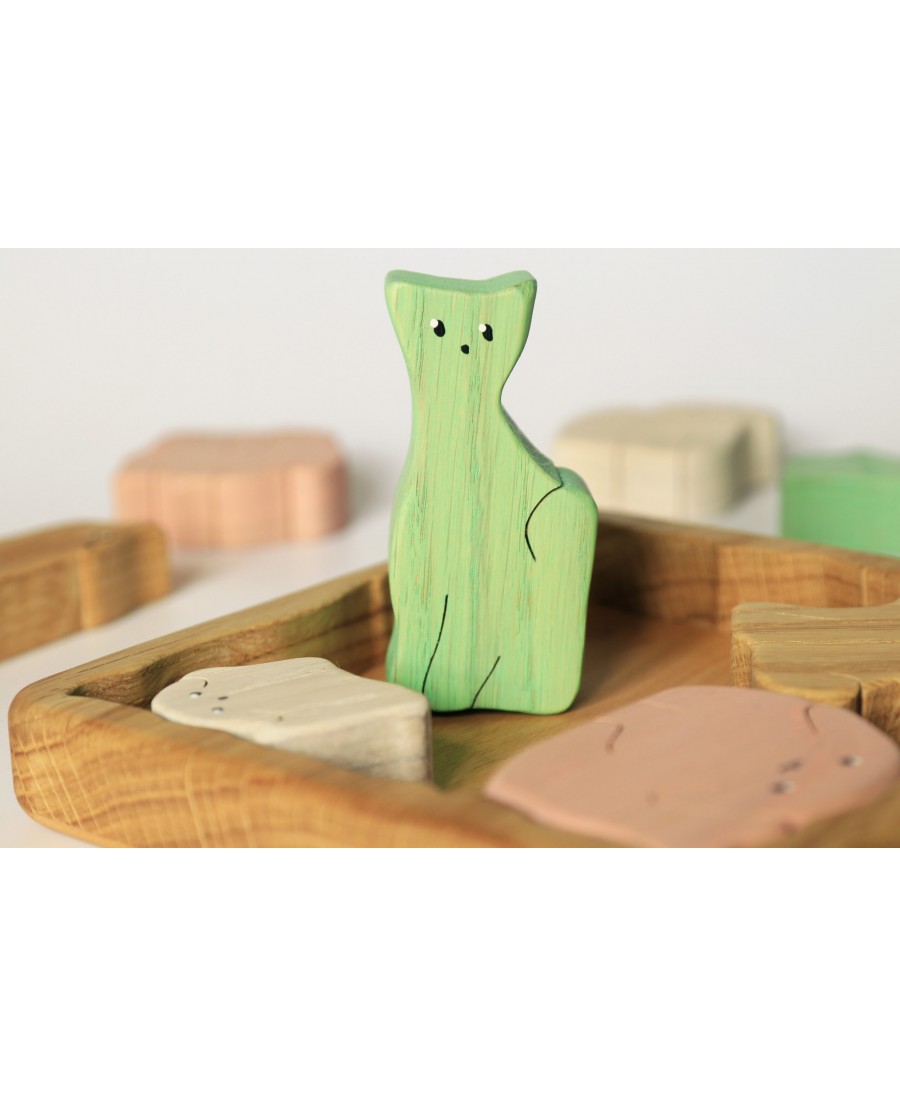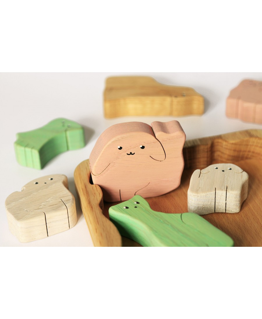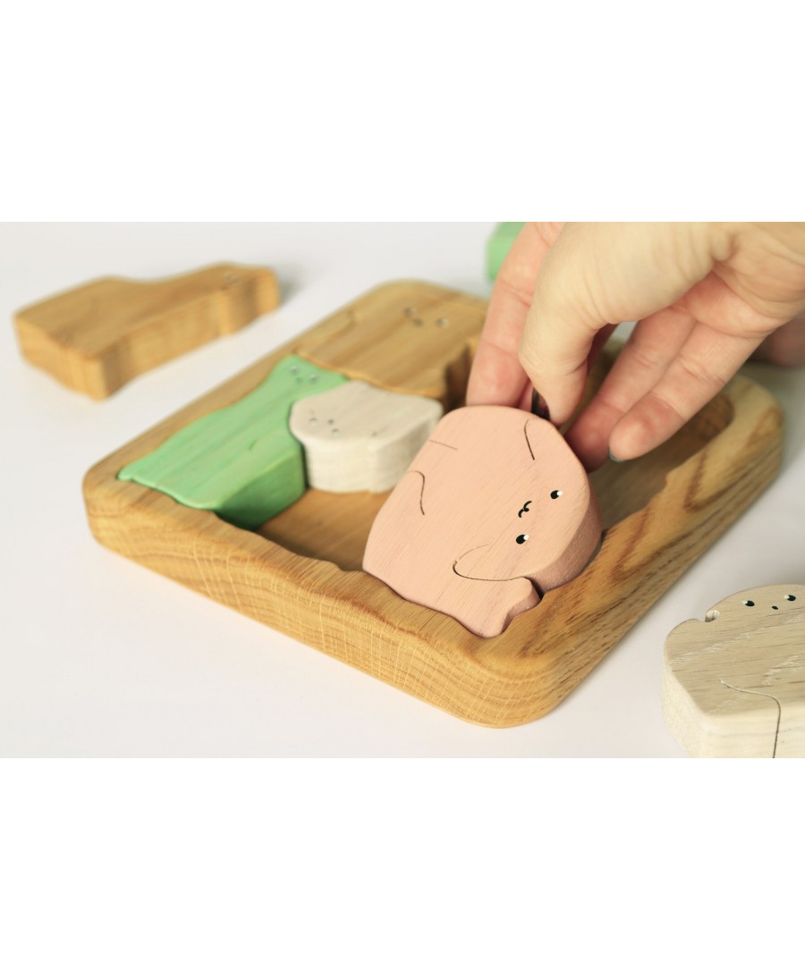 Ta drewniana układanka wykonana jest z naturalnego dębu i składa się z 8 elementów o różnych kształtach i kolorach. Drewniane puzzle pomogą Twojemu dziecku poznać nazwy zwierząt, ich kształty, wielkość i kolor. To świetny sposób na rozwijanie wyobraźni i kreatywności poprzez odgrywanie ról. Figurki zwierząt pomagają także rozwijać umiejętności motoryczne i mowy.