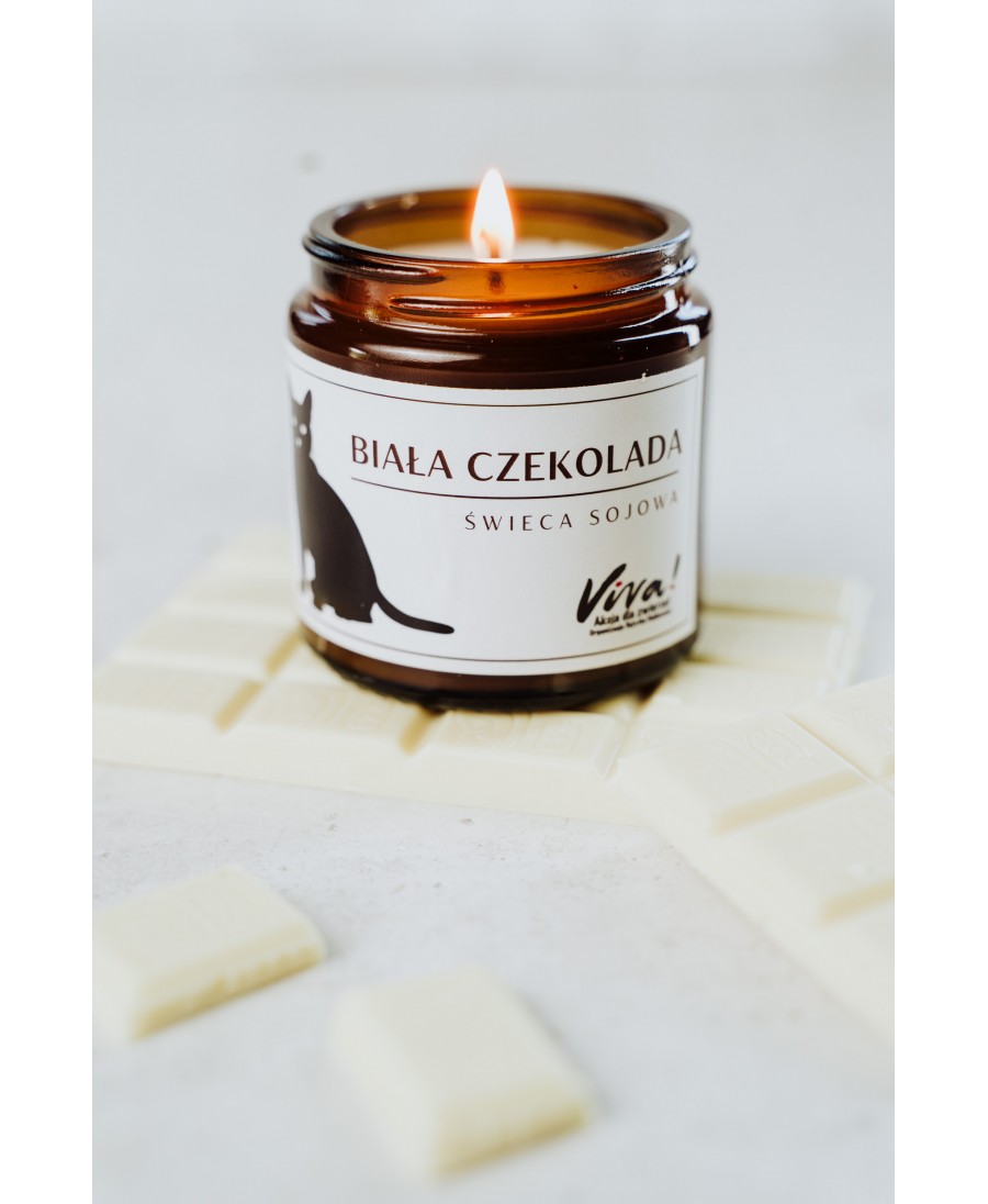 Świeca sojowa o zapachu białej czekolady, stworzona specjalnie dla Fundacji Viva! z naturalnego, wegańskiego wosku sojowego. Przyjazna środowisku i nietoksyczna, idealnie nadaje się na prezent.