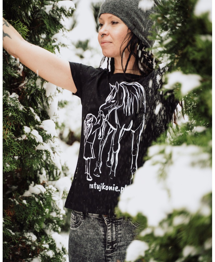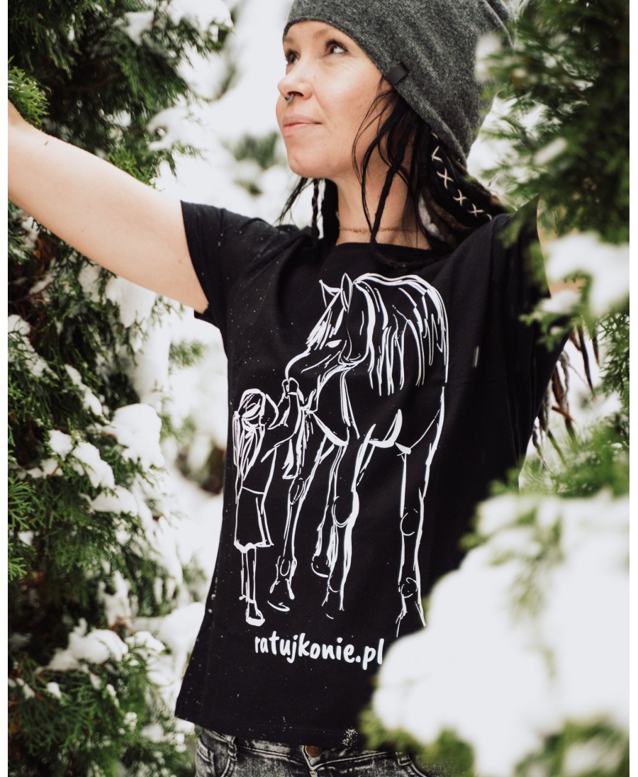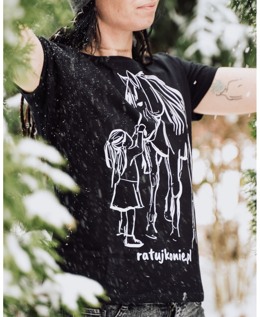 Koszulka damska RATUJ KONIE - dziecko i konik czarna
